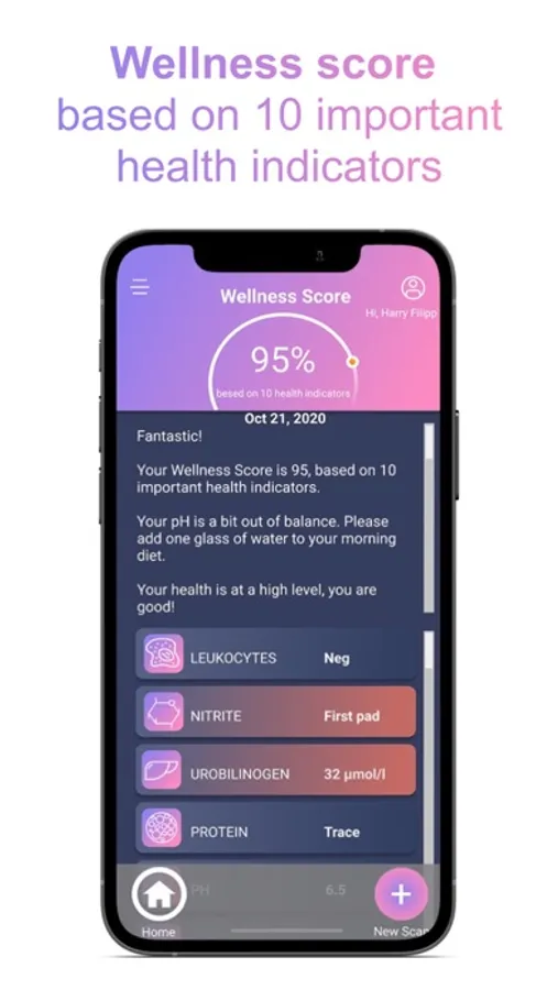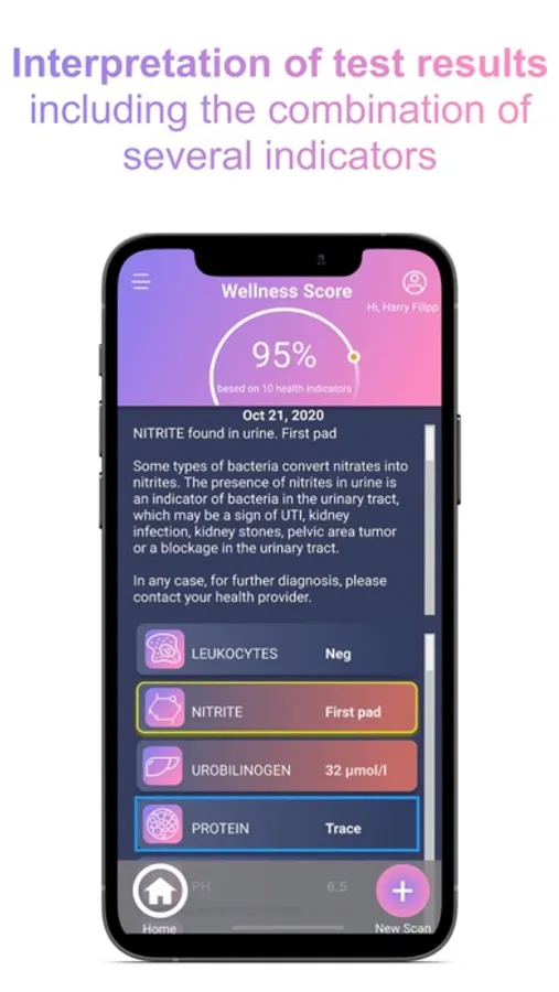 Scan. Our app automatically scans test strip analyzing discolorations of the reagents