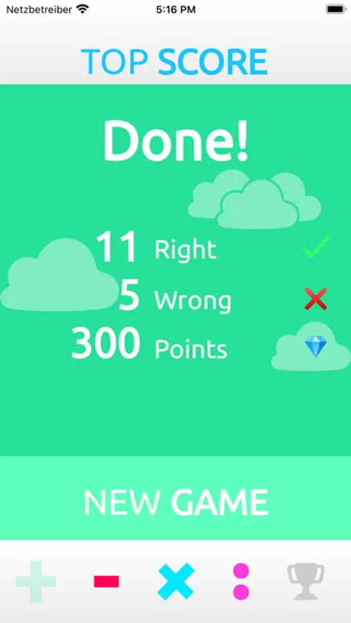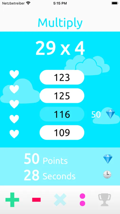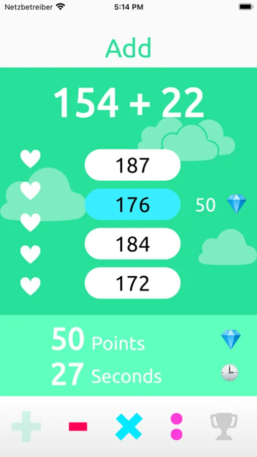 Rules of the game: To answer each question you have about 30 seconds. If you answer the question right you get points. If you answer any question wrong you loose a heart and points too. The game is over when you have lost all your hearts or when the time is up. At the end of a task there is a rating system which shows you how well you did. In addition, this arithmetic game has a top-score. You have an infinite number of chances to improve your mathematic skills playing this game.