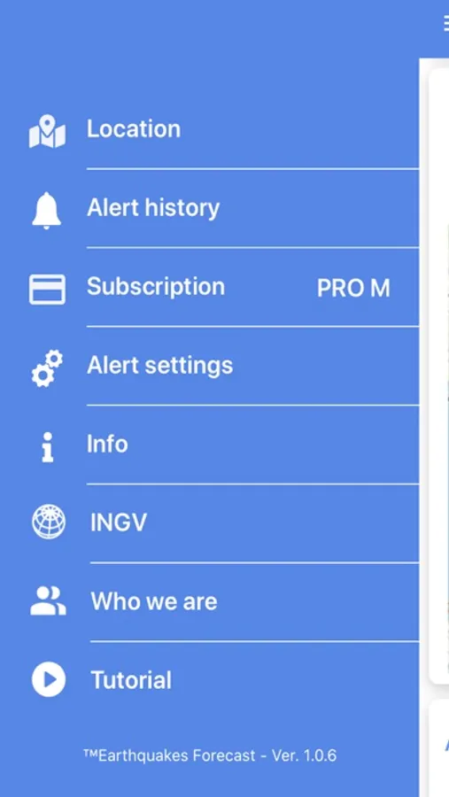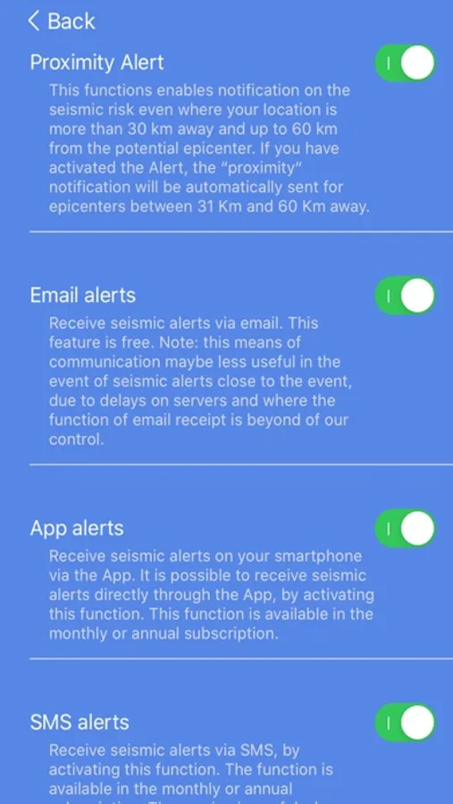 The functions of receiving pre-seismic sound alerts ("lifesaving" alert) and indicating the potential epicentral location of the future earthquake require the subscription to the BASE or PRO subscription for a fee, but it is possible to take advantage of a trial period of 30 free of charge. days.