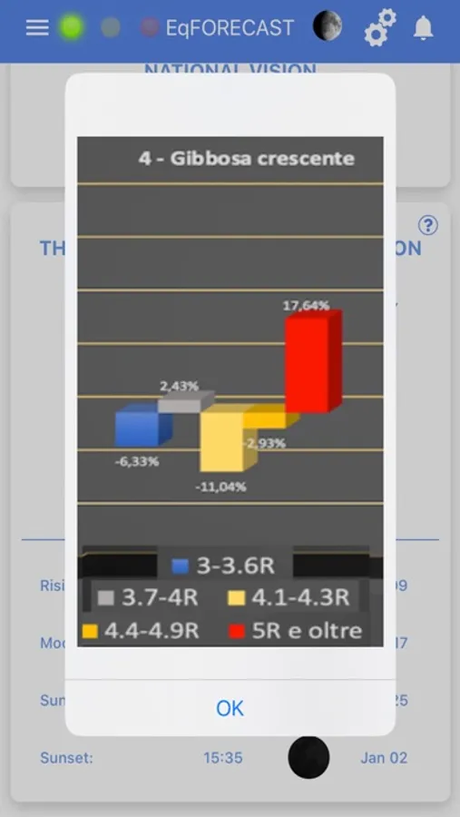 Once registered and logged in, with the FREE default version the user can view the seismic risk prediction in the 2 dimensions of the seismic risk time and the maximum expected magnitude (Richter) in the App home, but you will not yet be enabled to prediction of the location at risk (possible epicenter), nor upon receipt of sound notifications of pre-seismic alerts.