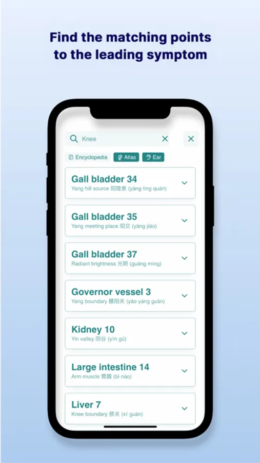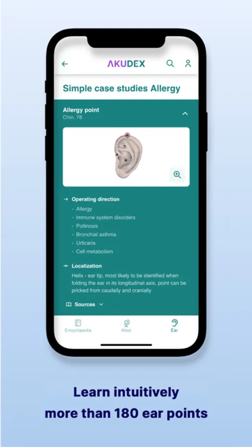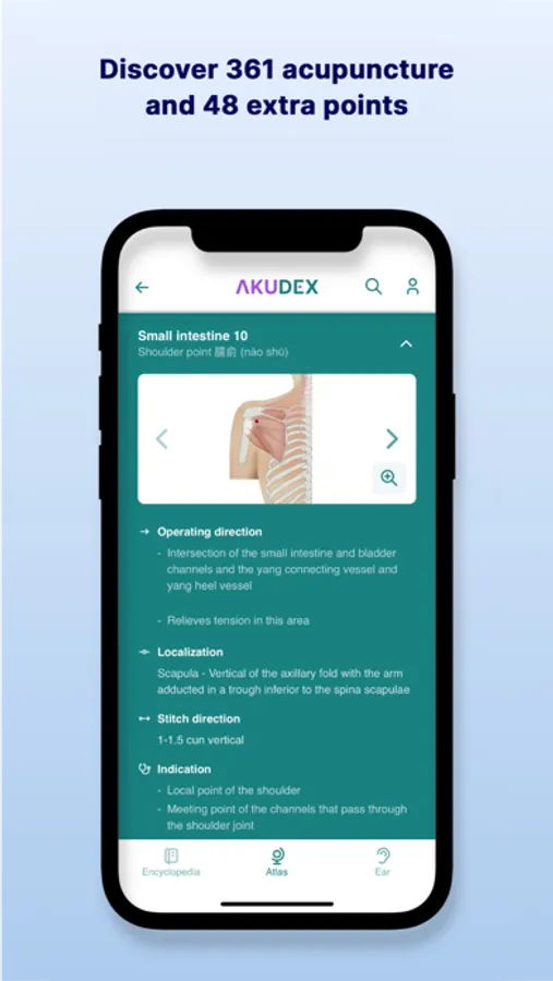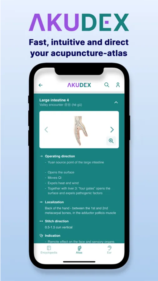 AKUDEX Acupuncture combines the knowledge from the most important literature on acupuncture and TCM in one app. In AKUDEX Acupuncture you will find all 361 classical points and 48 extra points of acupuncture. With over 180 ear points, 40 Western leading symptoms and more than 50 TCM syndromes, it is a comprehensive reference book that you can always have with you and even use offline. 80 concisely summarized studies illustrate the effectiveness of acupuncture for various indications. By means of an encyclopedia, complex interrelationships of Traditional Chinese Medicine and clinical leading symptoms are presented in an understandable way. In addition, you will receive information on more than 150 foods according to TCM aspects.