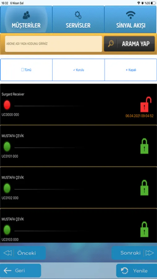 Uçar Güvenlik Bayileri ve zincir mağazalar alarm merkezi abonelerinin durumunu(Alarm Devrede , Alarm Devre dışı),Abonenin son 30 alarm sinyalini, Tarih aralığında aboneden gelen sinyalleri ve Bayiye aboneler için yazılan teknik servis formalarını bu program aracılığı ile takip edebilirler.