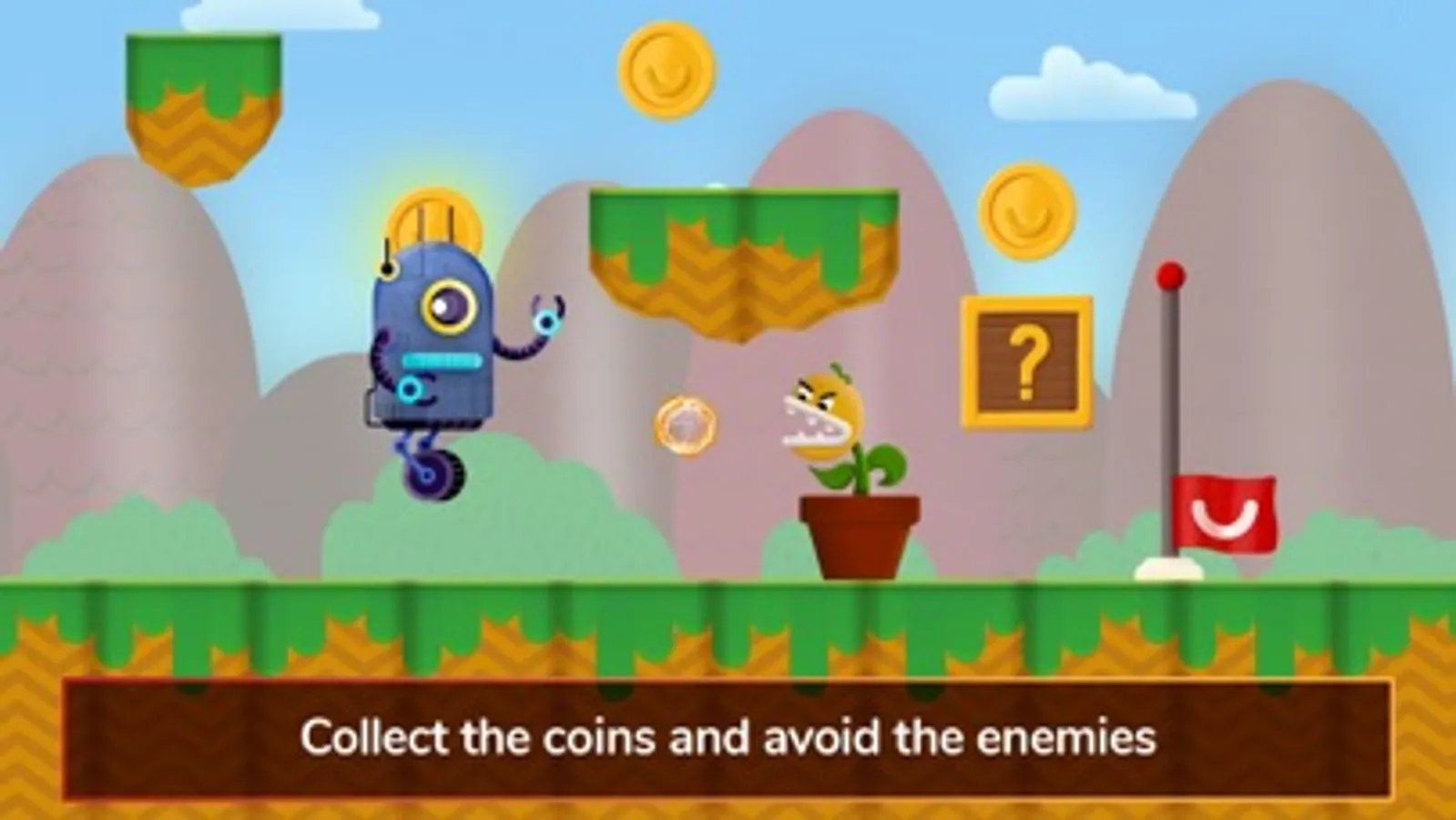 Play and learn freely without pressure or stress. Think, act, observe, ask yourself questions and find the answers. Have fun making the robot move forward, jump and perform all kinds of actions to complete the level.