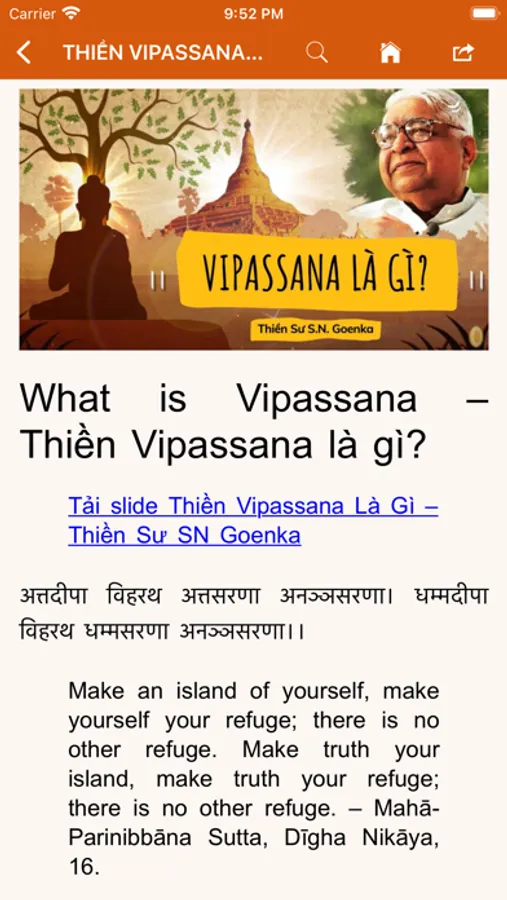 Thiền Vipassana là một phương pháp thiết thực để huấn luyện tâm, thanh lọc tâm, nhằm đạt đến sự bình tâm thực sự và để có một cuộc sống hữu ích & hạnh phúc thực sự. Vipassana có nghĩa là “có nghĩa là thấy mọi thứ như đúng như thật”. Đó là một tiến trình khách quan của sự thanh lọc tâm thông qua sự tự quan sát. Phương pháp thanh lọc tâm này giúp con người đối mặt với những căng thẳng trong đời sống và các vấn đề một cách bình tĩnh và quân bình, không còn bị chi phối bởi phiền não do tham ái, si mê, ngã mạn, không còn vô minh.