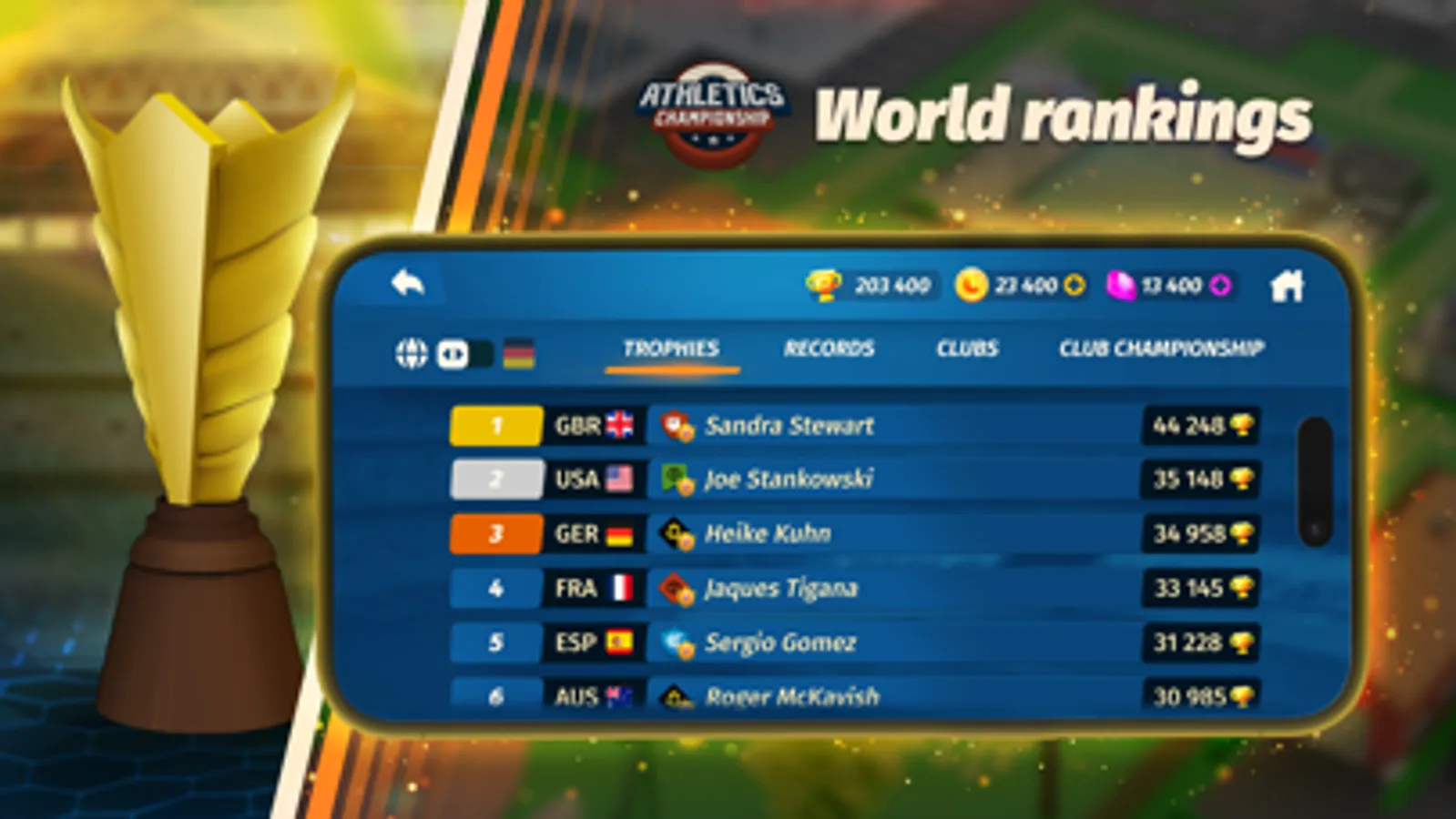 ● Duel players from around the world in athletics competitions and take their Trophies