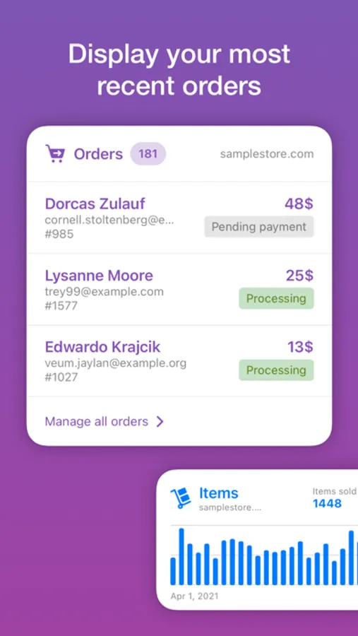 With the large orders widget, you can see your most recent 3 orders and its details. You can filter to include all orders or just the ones that needs further processing(processing, on-hold and pending order statuses). Tap on an order and go directly to your WooCommerce admin page in your browser.