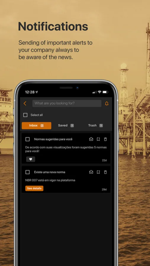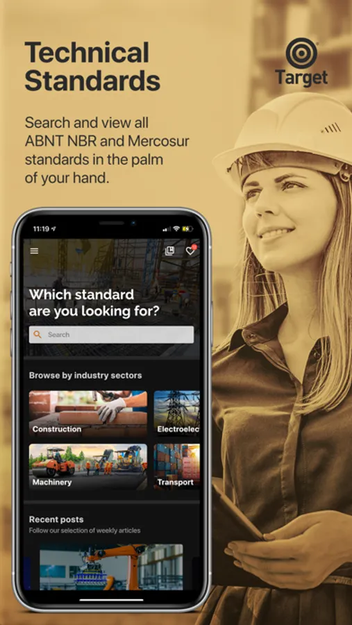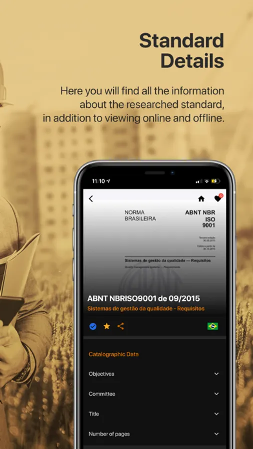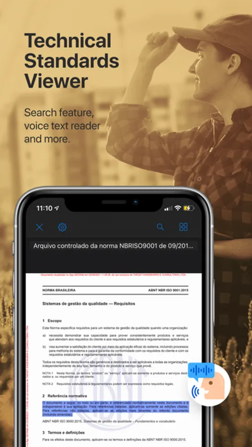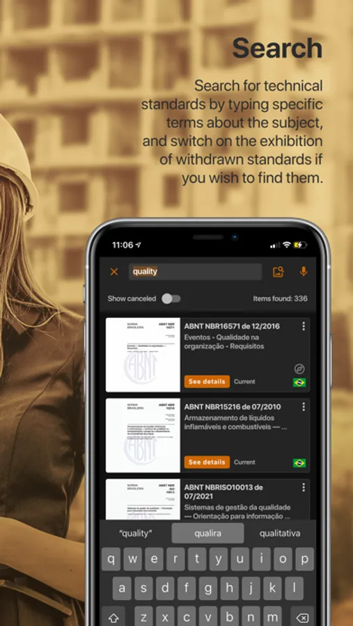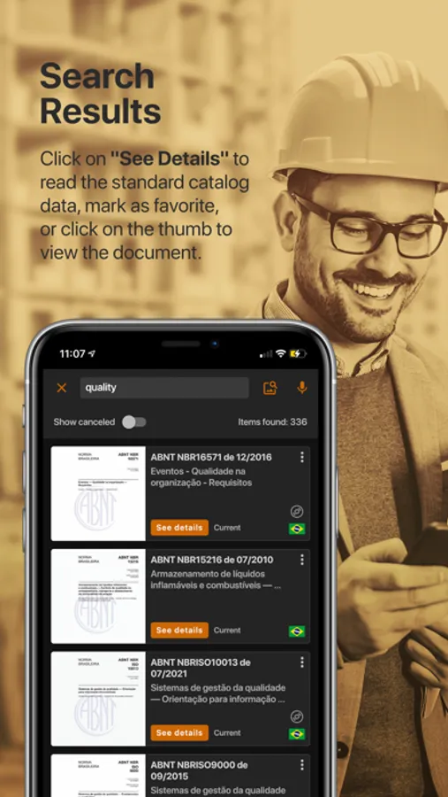 Search in all ABNT NBR and Mercosur standards. Use the text, voice or image search features. That's right! Take a photo and research the standards related to the subject.