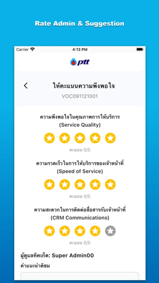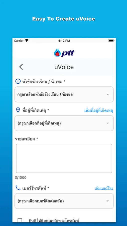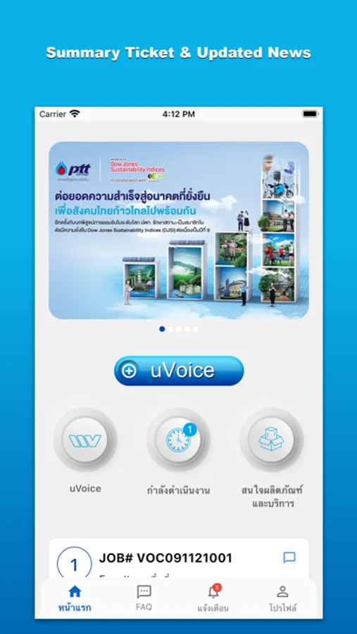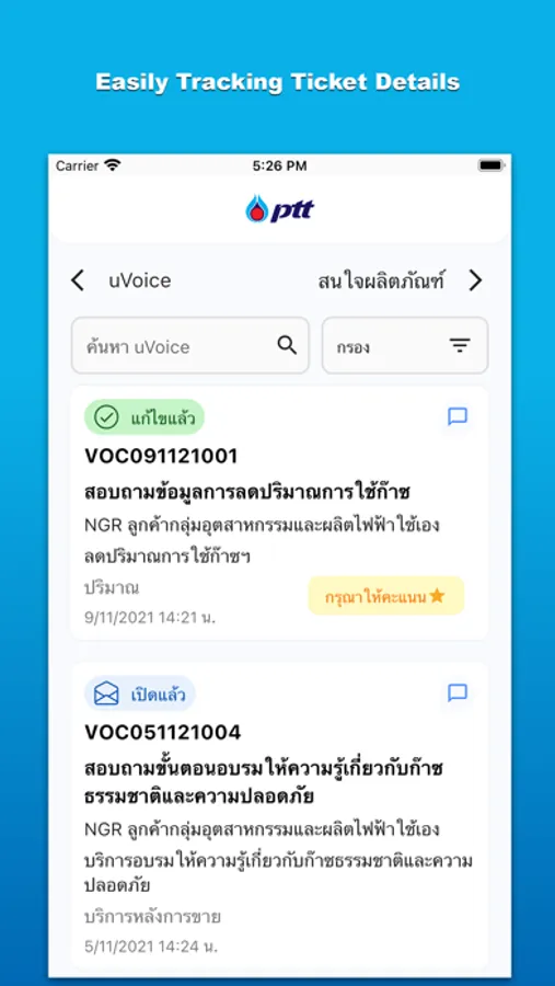 ‘uVoice’ is a new application to get customer feedback for PTT Public Company Limited. A new easy-to-use and fastest way to report any problems for customer of our company. Customers under Natural Gas Supply and distribution business, Gas Separation Plants (GSPs) business, Natural Gas Transmission System Business, and PTT NGV business can easily report and communicate with our staffs, and able to get a real time feedback. Users will get a smoother and faster supports and receive the best experiences. Users can also give a rating and feedback for the quality of services provided by our staffs. This would be useful for our company to improve our services in the future.