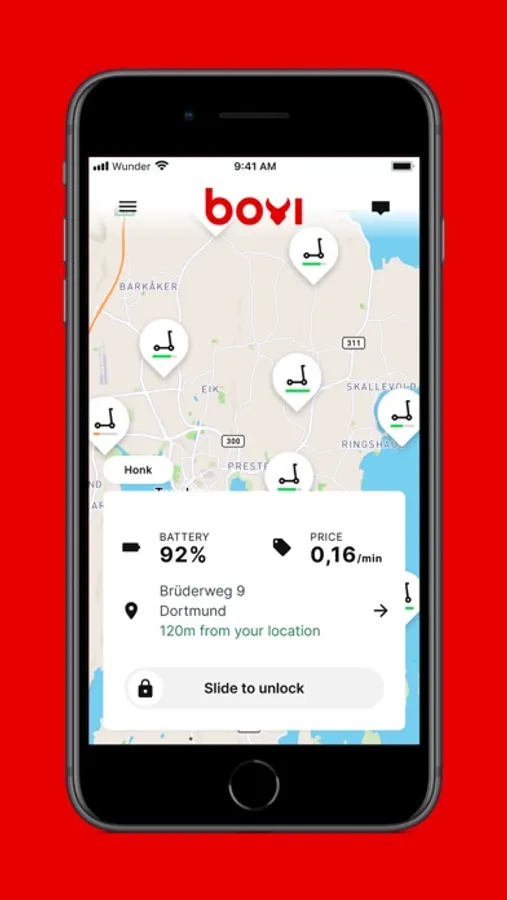 Med vår enkle og brukervennlige app kan du registrere deg på få minutter og legge til din foretrukne betalingsmåte. Deretter kan du finne en av våre sparkesykler på definerte lokasjoner, skanne QR-koden og begynne din reise med ett tastetrykk. For å senke farten, bruker du enkelt håndbremsene på venstre eller høyre side.