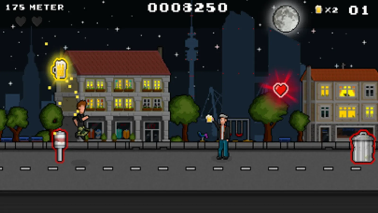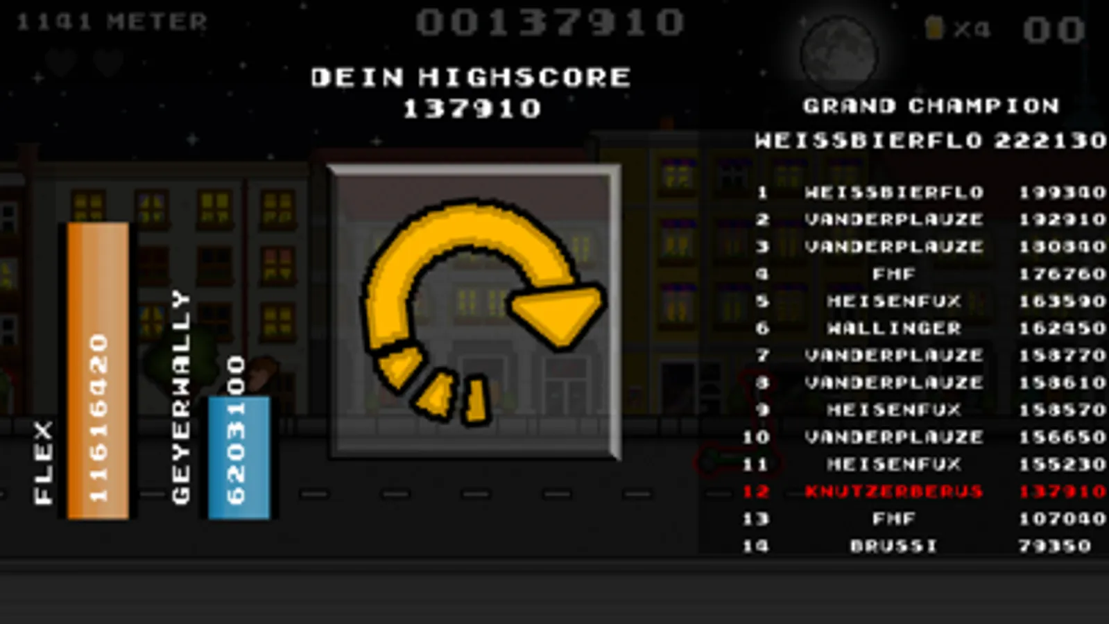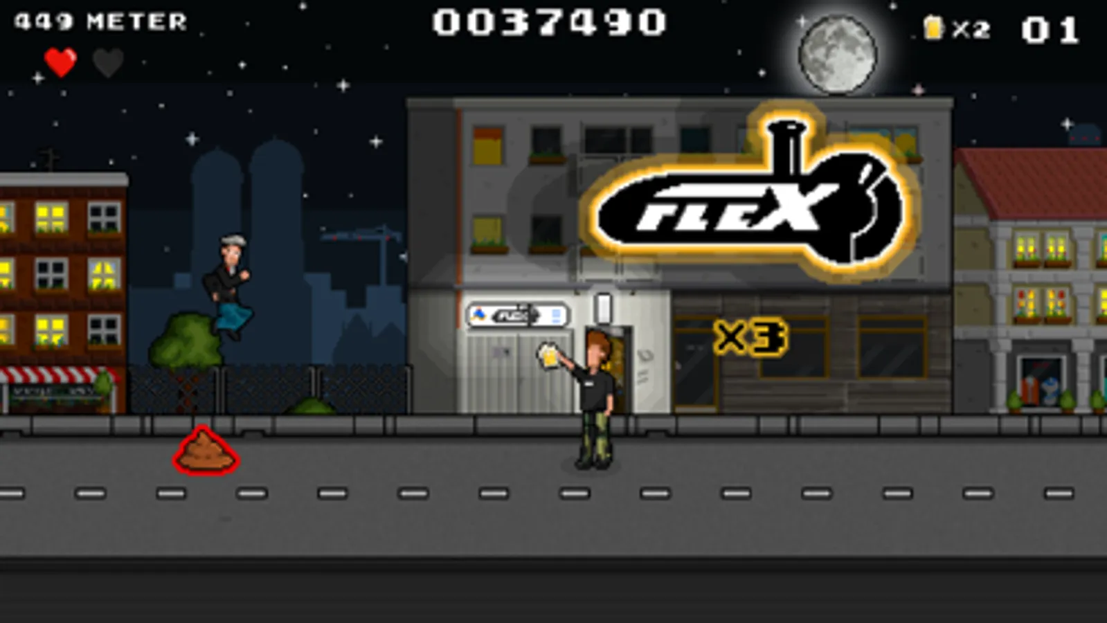 Die gesammelten Biere kannst Du durch Anstoßen in ordentlich Punkte verwandeln. Und angestoßen wird natürlich mit dem Wirten vom anderen Team. Doch obacht! Je weiter Du kommst, desto schneller wird die Spielgeschwindigkeit. Vorbei an Sechzger Stadion, Frauenkirche und anderen Silhouetten der Münchner Stadtkulisse, kommst Du bald an der Geyerwally oder dem Flex selbst vorbei. Diese Meilensteine werden mit Vervielfachung der neu gesammelten Punkte belohnt. Mit ein bisschen Glück kannst Du auch zusätliche Herzal einsammeln. Sie sind Dein Joker wenn Du dann doch Mal in einen Hundehaufen oder Hydranten rennst. Am Ende hast Du die Chance in den Top Einhundert zu hupfen oder sogar den Grandchampion zu stellen.
