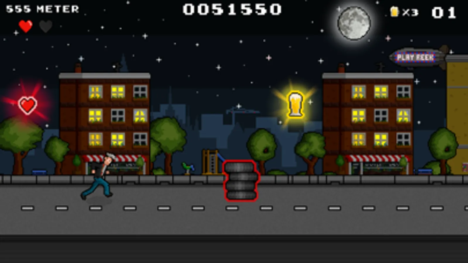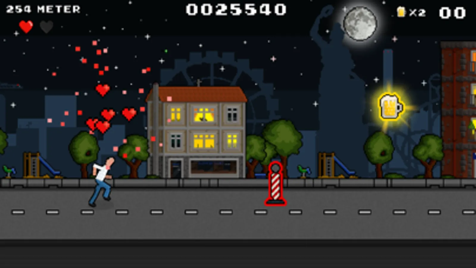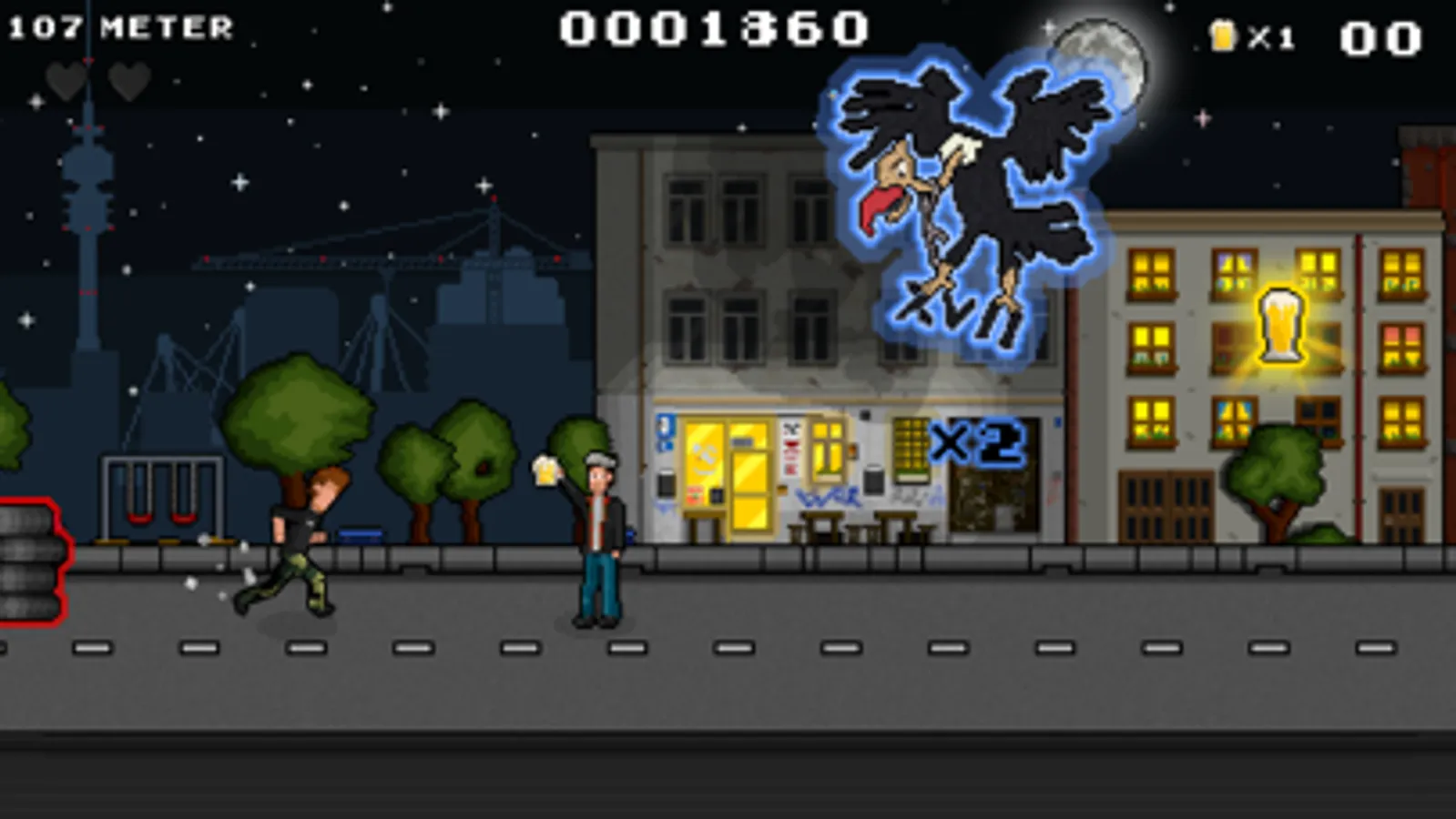 Die gesammelten Biere kannst Du durch Anstoßen in ordentlich Punkte verwandeln. Und angestoßen wird natürlich mit dem Wirten vom anderen Team. Doch obacht! Je weiter Du kommst, desto schneller wird die Spielgeschwindigkeit. Vorbei an Sechzger Stadion, Frauenkirche und anderen Silhouetten der Münchner Stadtkulisse, kommst Du bald an der Geyerwally oder dem Flex selbst vorbei. Diese Meilensteine werden mit Vervielfachung der neu gesammelten Punkte belohnt. Mit ein bisschen Glück kannst Du auch zusätliche Herzal einsammeln. Sie sind Dein Joker wenn Du dann doch Mal in einen Hundehaufen oder Hydranten rennst. Am Ende hast Du die Chance in den Top Einhundert zu hupfen oder sogar den Grandchampion zu stellen.