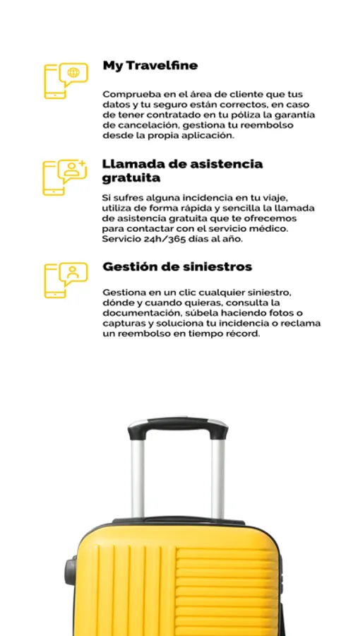 My Travelfine: comprueba en el área de cliente que tus datos y tu seguro están correctos, en caso de tener contratado en tu póliza la garantía de cancelación, gestiona tu reembolso desde la propia aplicación.