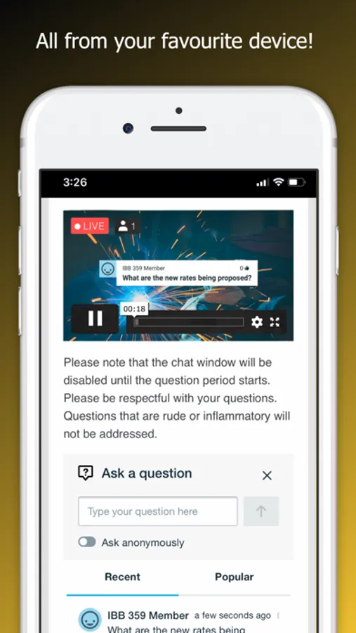 Keep up to date with your Union using the Boilermakers Local 359 live broadcast application. Watch live streaming business manager updates on your mobile device from the comfort of your home. Interact with your Union by asking questions and responding to polls.