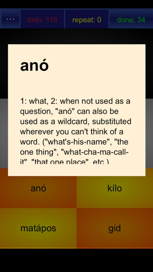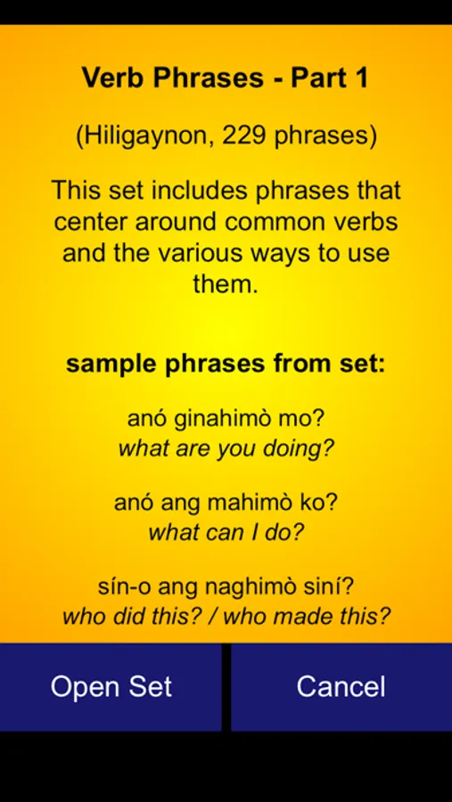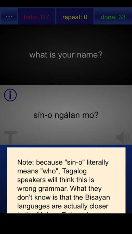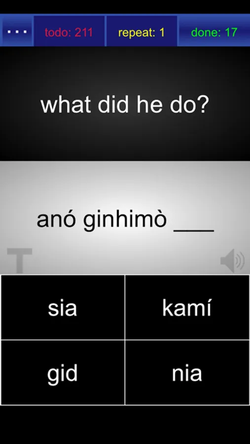 The app allows users to learn each sentence through trial and error. They are shown an English translation and tasked to build the corresponding Ilonggo phrase word by word. If they make a mistake, the phrase is automatically put in a "repeat" pile, and they will be given another chance sometime later to try again until they get it right.