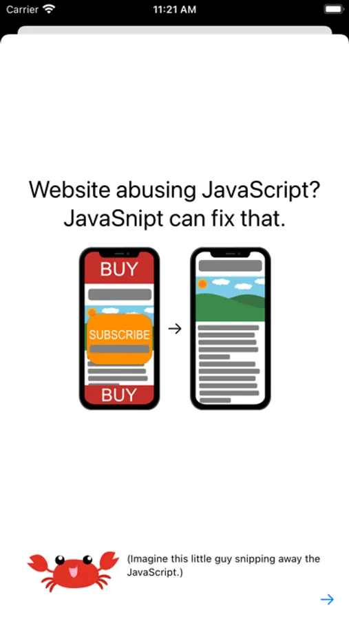 The crab is Snippy, our mascot. Think of this app as him snipping away the extra JavaScript.