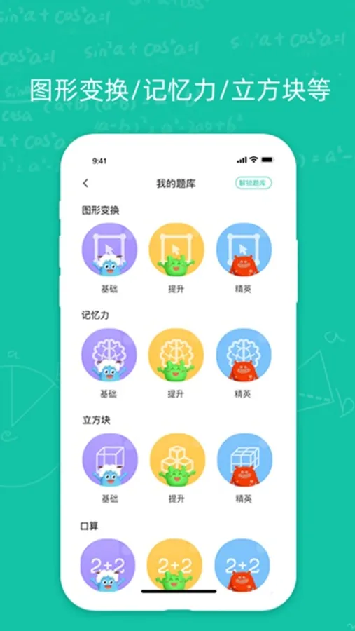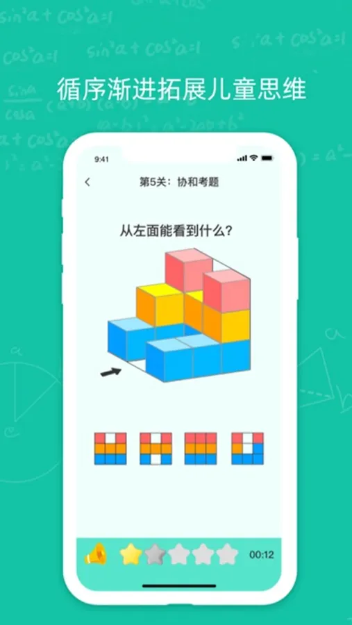 1、提供多元化的内容学习,包括图形变换、加减法、空间想象力、记忆力、立方块、九空格等;