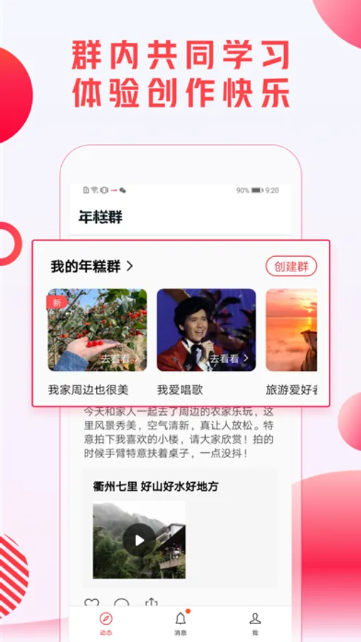 【众多兴趣群】广场舞、摄影、剪辑视频、唱歌、书法等多兴趣群组供你选择。