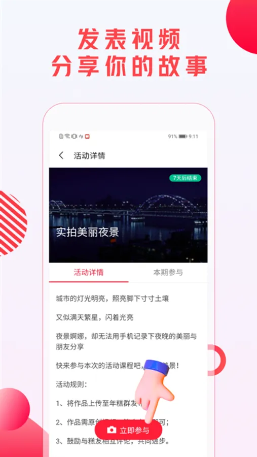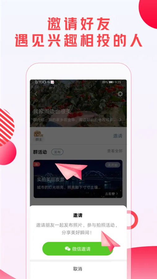 【共同学习】众多兴趣相投的人,共同学习,共同创作,共同提升。建群——发布活动——邀请好友——发布视频——参与活动,共同打造高品质兴趣圈子。