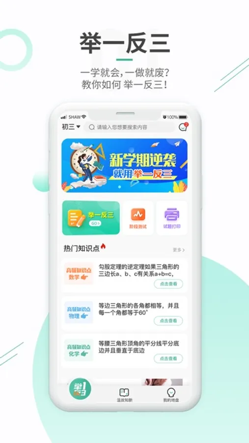 举一反三旨在为学生提供优质的学习资源,在线智能练习个性推荐。一线名师精心划分知识点,配合详尽的解题思路,精准分析学习成效,错题再练查漏补缺,真正帮助用户实现“做一题会一类”的目标。