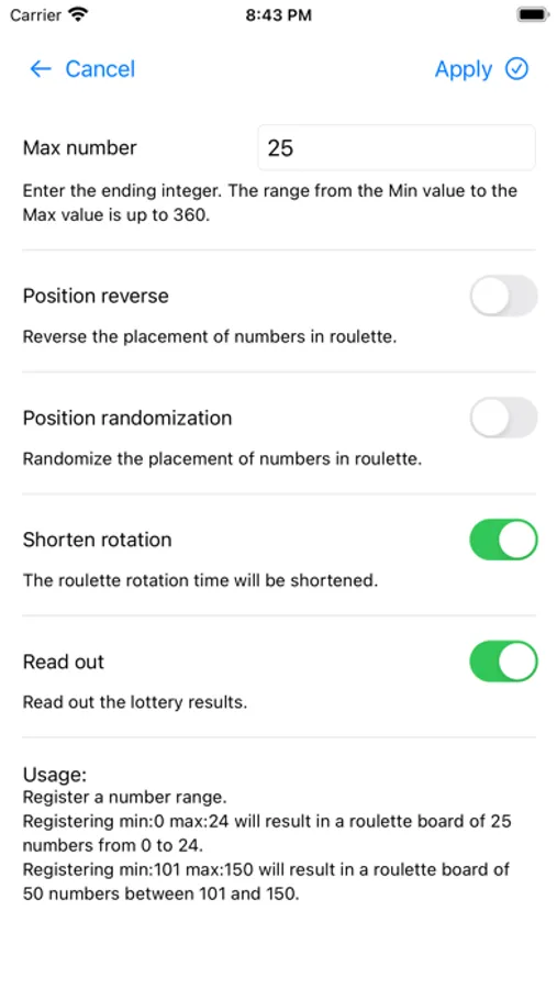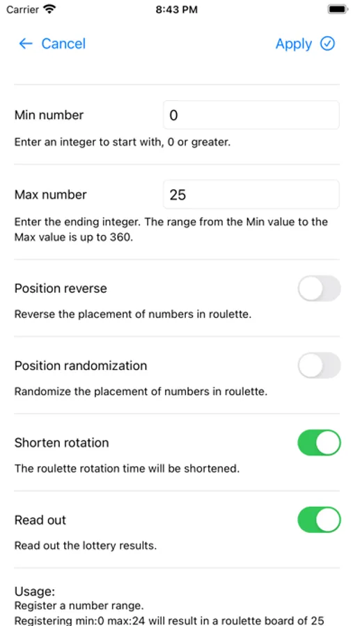 Register the minimum and maximum values in integers greater than or equal to zero to complete the roulette.