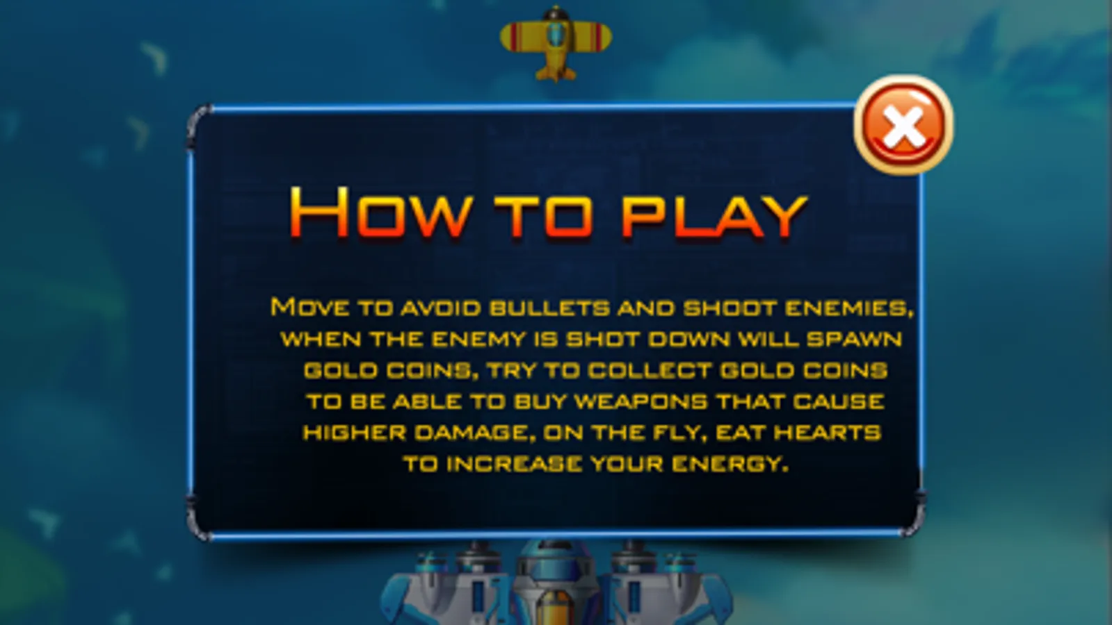 Move to avoid bullets and shoot enemies, when the enemy is shot down will spawn gold coins, try to collect gold coins to be able to buy weapons that cause higher damage, on the fly, eat hearts to increase your energy.