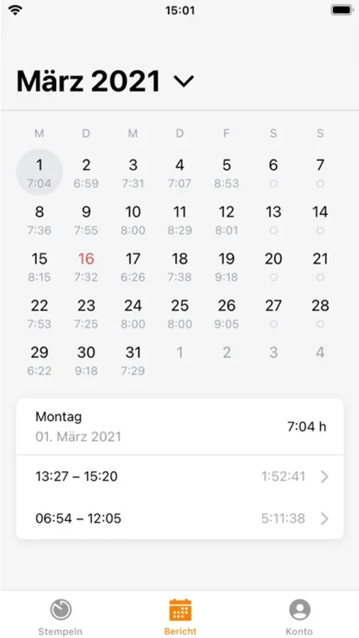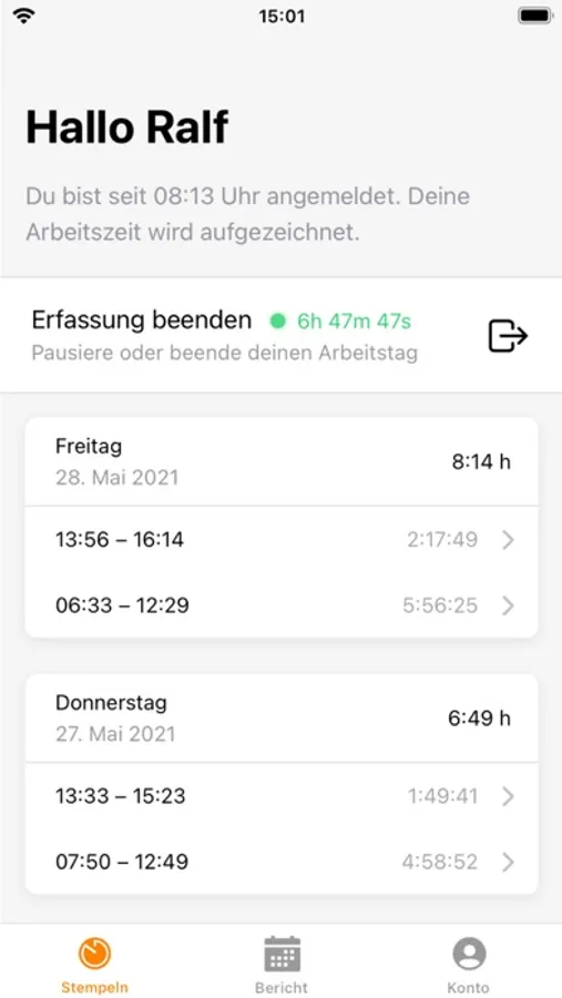 Erfassen Sie Ihre Arbeitszeiten bei Außenterminen, nehmen Sie Änderungen an bestehenden Zeiten vor und behalten Sie stets den Überblick über Ihre geleistete Arbeitszeit.
