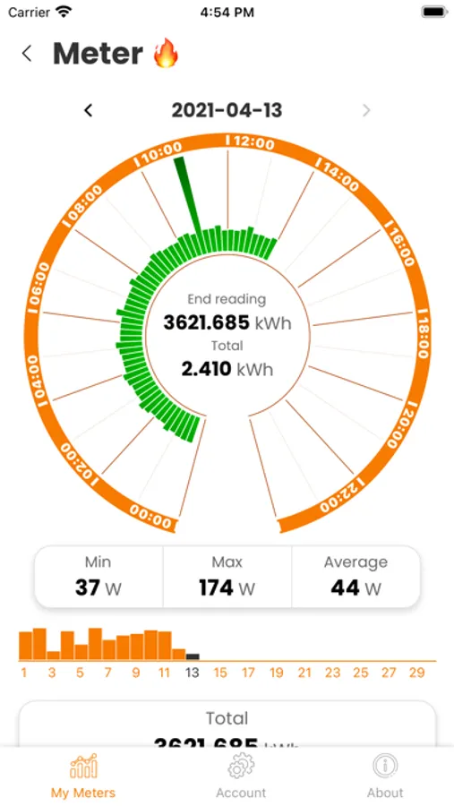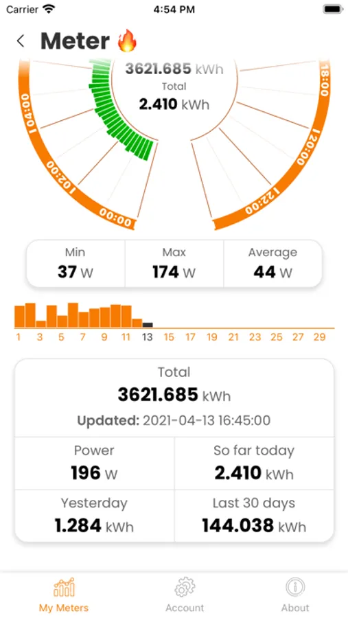 See instant power usage sent from the meter every few minutes. kWh energy profiled in 15 minute increments.