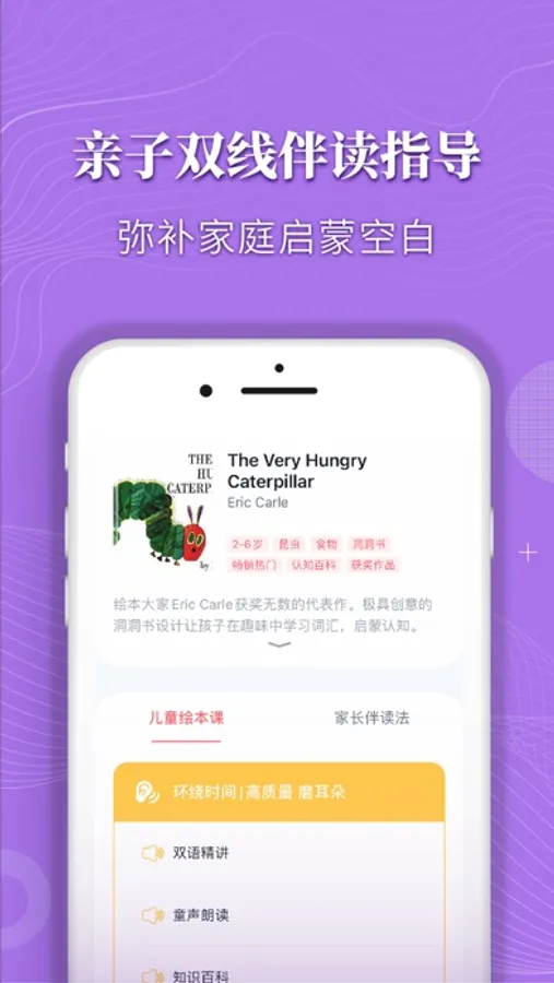 父母与孩子共同学习,填补家庭场景内的英文阅读启蒙空白。让父母通过掌握伴读方法,更轻松Get怎么读绘本,让孩子通过磨耳和与家长共读,更有效开展语言启蒙。