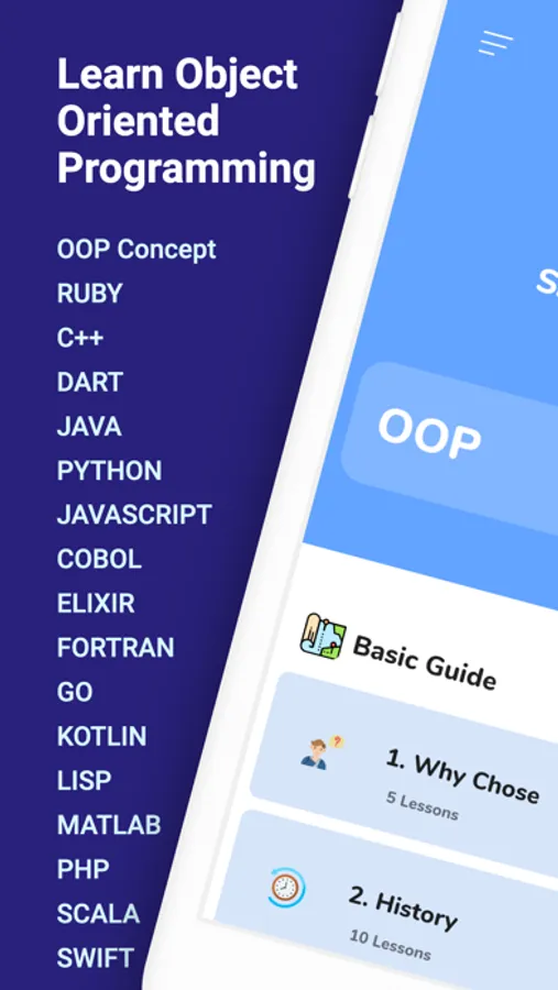 In this app, We are going to share free oop programming languages you can take to learn OOP basics to advance or improve your object-oriented programming skills.