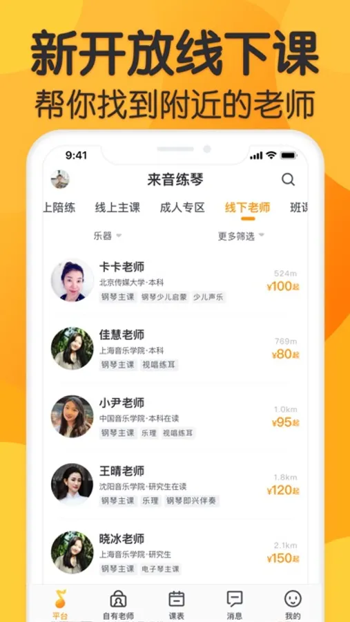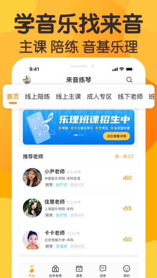 全球上万名专业音乐老师都在来音平台上开设课程,为学员开设各种乐器的陪练课、线上线下主课、音基乐理等课程。在App中你可以自由选择老师和约课,无需购买课包,平台有监督,上课有保障。
