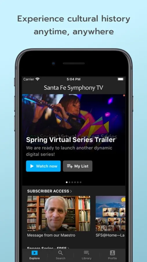To access all features and content you can subscribe to The Santa Fe Symphony on a monthly or yearly basis with an auto-renewing subscription right inside the app.* Pricing can vary by region and will be confirmed before purchase in the app. In app subscriptions will automatically renew at the end of their cycle.
