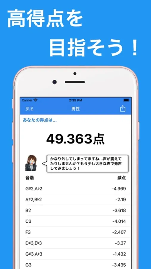 できるだけ音程を外さず発声し、高得点を目指そう!