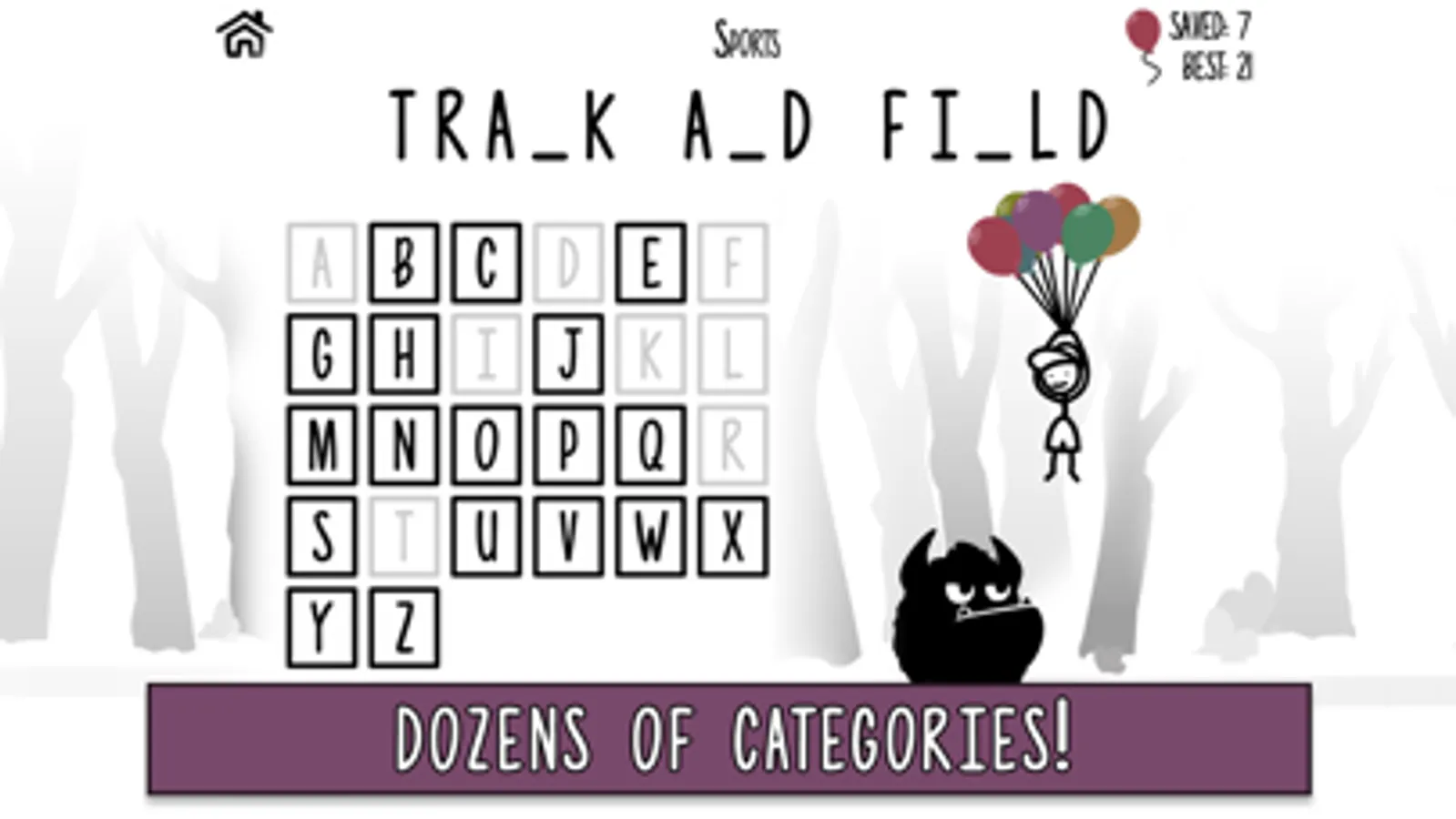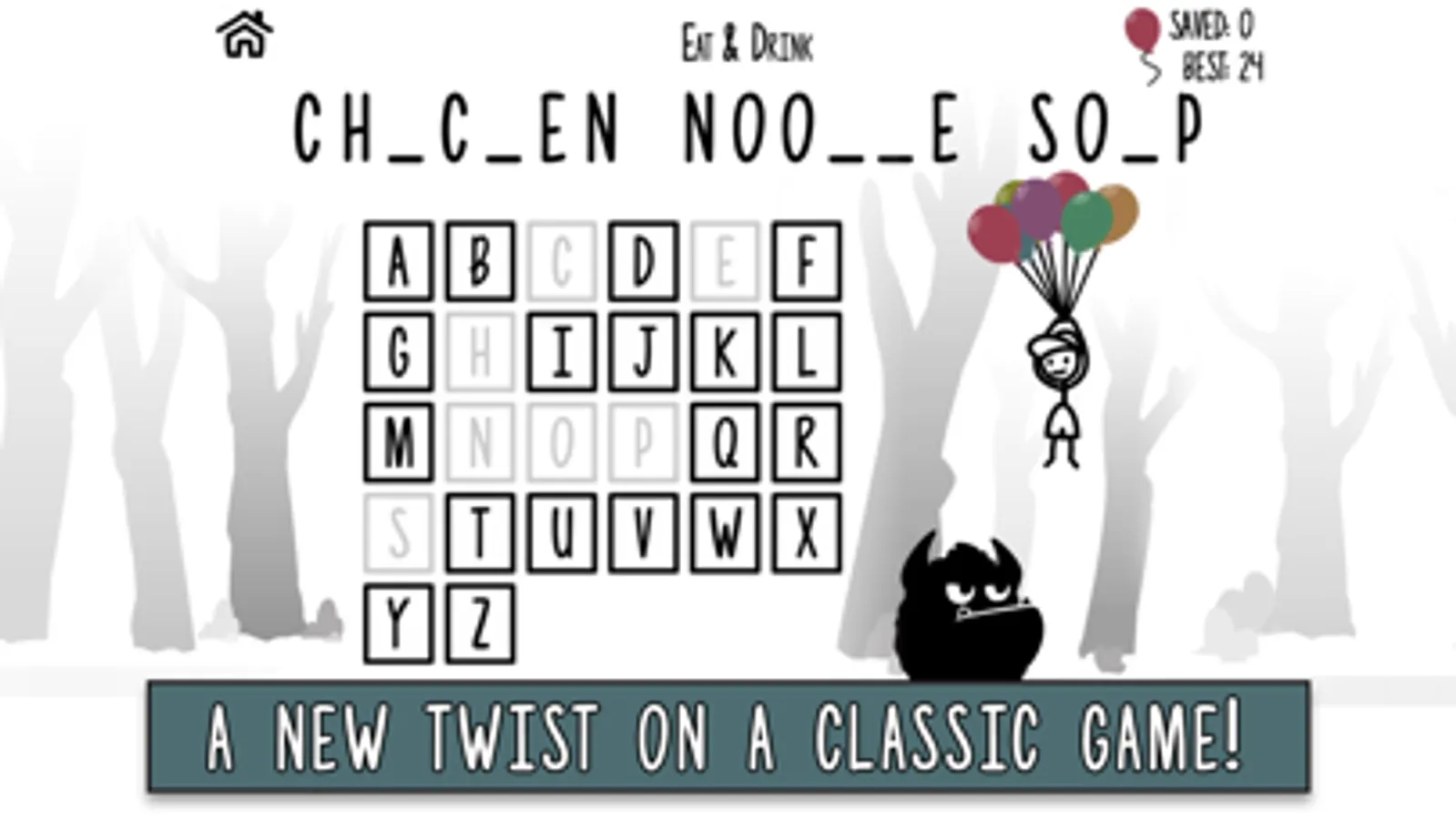 Your goal is to guess the word or phrase to save the player from the hungry monster. Guess one letter at a time to see if it’s in the Hangman word. Tap on a letter to guess it and the letter will fill in a blank space if you guess a letter correctly. If not, you’ll pop a balloon and get closer to falling in the beast’s mouth! Try to guess the word or phrase once you have enough correct letters on the Hangman board.
