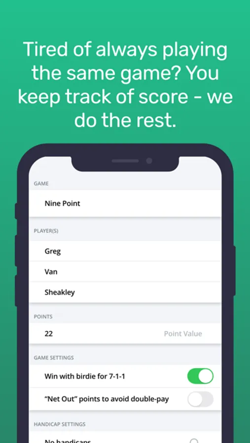 * Learn new game formats. Just input your gross score, the scoring algorithms take care of the rest.