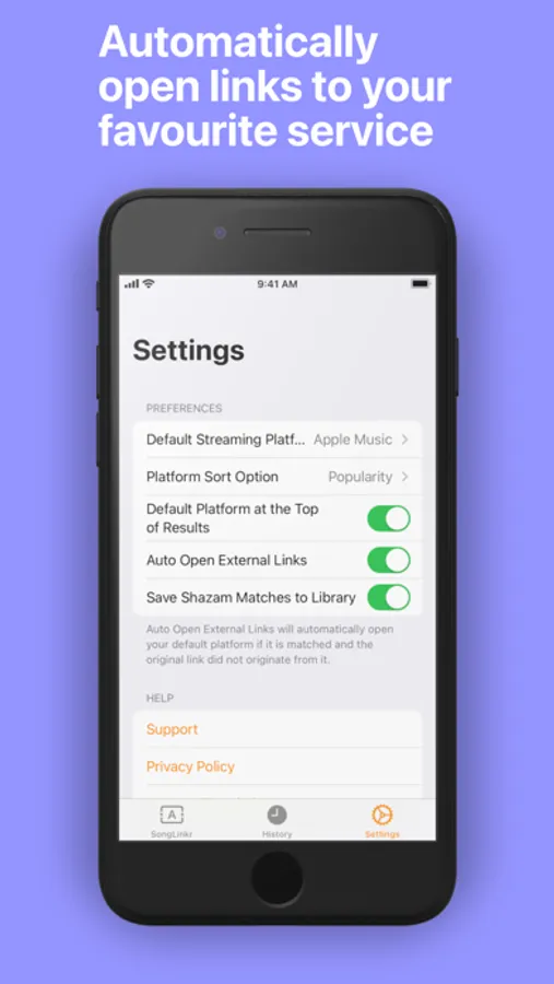 Simply copy a link to a song and SongLinkr does the rest for you. Open the app and see the link automatically pasted to the search bar, click search and view a list of matched platforms. And if you have Auto-Open Default Platform enabled, SongLinkr can intelligently recognise when a link is from your preferred music service and auto open that service if its not.