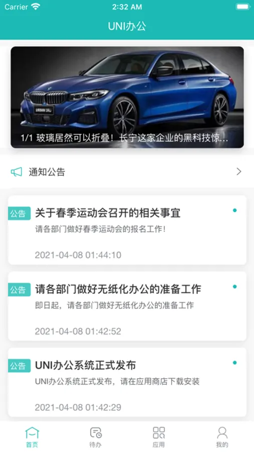 UNI办公系统主要为国内企业提供办公自动化信息服务,功能如:工作流、工作审批(报修申请、报销申请、领用申请、申购申请、请假申请、出差申请、加班申请、用工申请、接待申请、用车申请);个人中心(公告管理、消息管理、工作日志、我的日程、工作总结);知识管理(新闻动态、管理制度、下载中心等);日常管理(资产管理、车辆管理、档案管理、考勤管理、巡更巡检、合同管理、后勤采购、就餐统计、通讯录);人事管理(员工信息、奖惩管理、社保管理等)、考勤管理(班次管理、排班管理、我的排班、签到签退);巡更巡检(地点管理、巡更班次、巡更计划、我的排班、巡更记录);意见反馈、站点帮助、在线客服、一键换肤等功能模块。