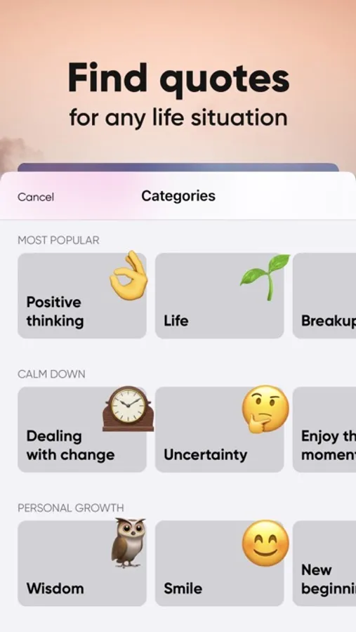 Whenever you need it, Inspiration is just a tap away. Whether you need motivation for working out, inspiration for relationships, or help to stay focused on your goal Inspiration is never far away, with so many categories to choose from, there is always a quote to help: