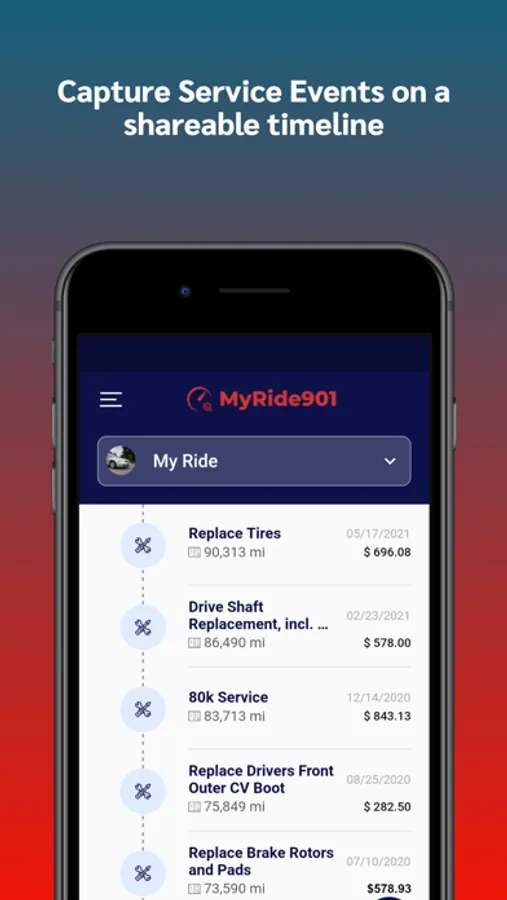 Meet MyRide901 which is the ultimate car manager and vehicle maintenance log app. Our car maintenance tracker keeps track of your vehicle maintenance by finding services that should be performed at your next service check and adding them to a searchable service timeline on your mobile device.