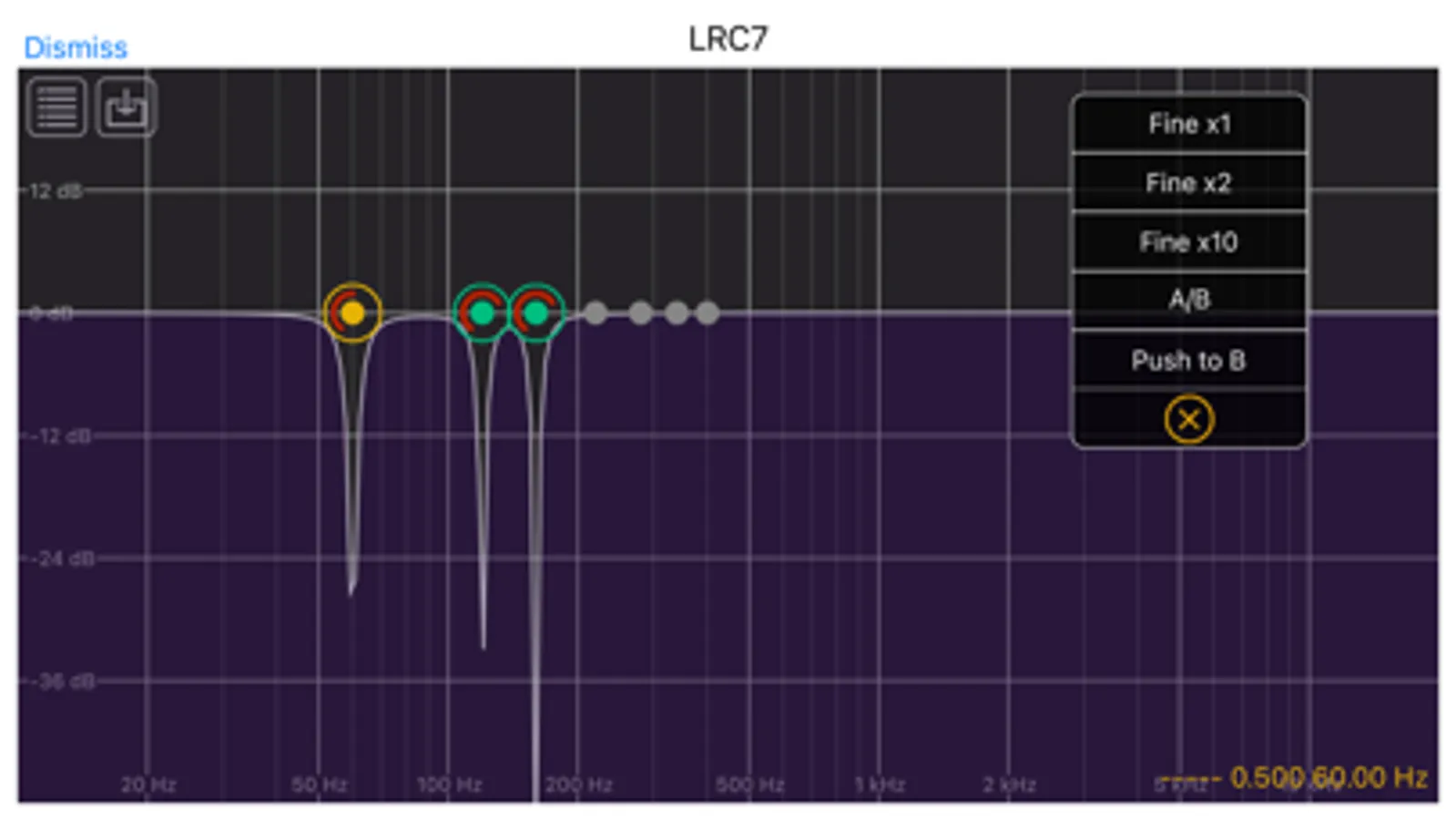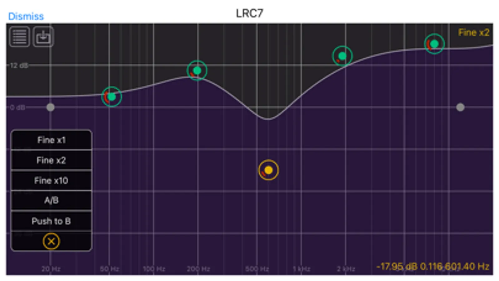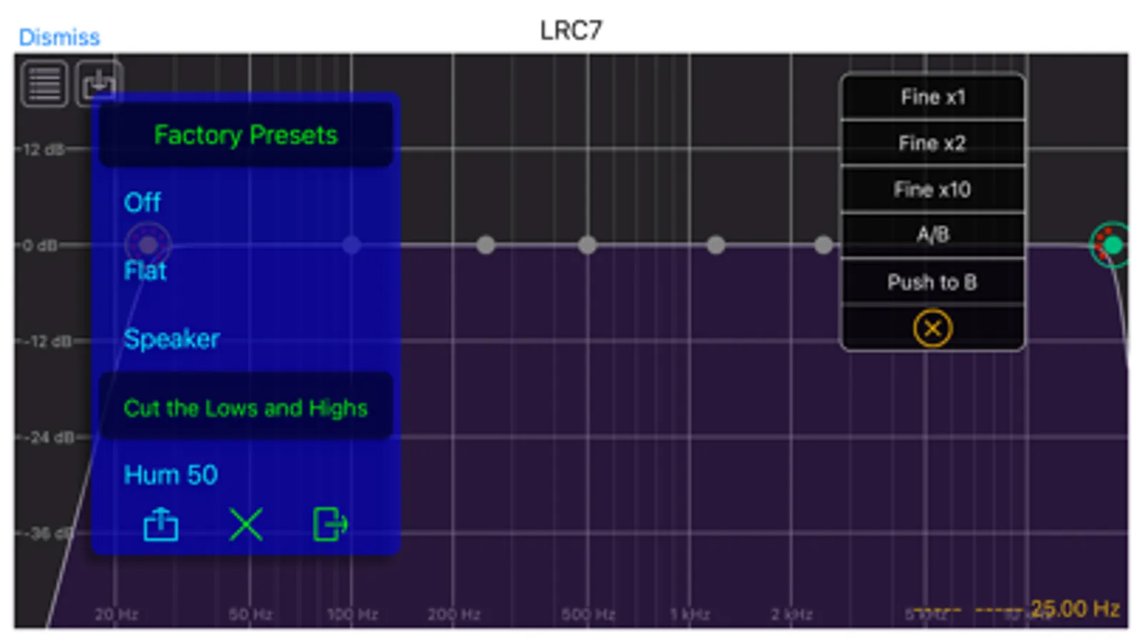 LRC7 is a seven-band EQ. It includes low shelf, high shelf, parametric peak/cut, notch, and various Butterworth low-pass and high-pass filters. Each of the bands can be configured to be any of the available filter types. Each band can also be turned off so that it passes the audio through unchanged, The frequency range for each of the filters is 10 Hz to 20 kHz. The filters aren't restricted to stay in any order. You can also set the "Q" factor of each of the filters. The value ranges from 0.0 to 1.0. The Q values behave differently in the different filter types.