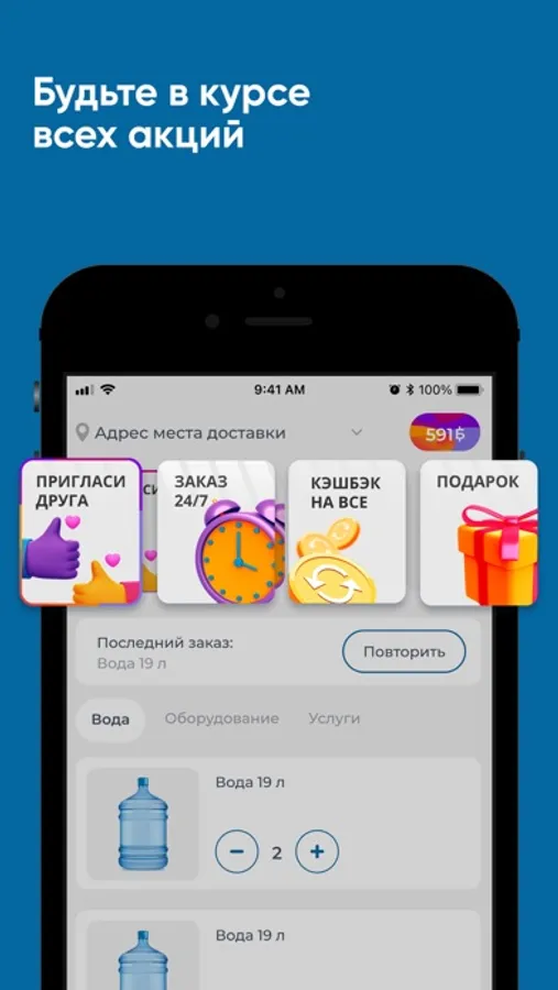 Заказать воду в приложении «АКВАДОМ Азов» просто и быстро. Все товары собраны по категориям. Добавляйте нужные позиции в корзину и оформляйте заказ в любое время суток.