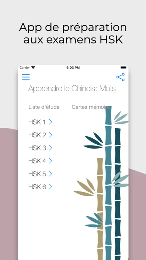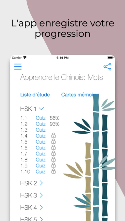 App de préparation aux examens HSK. Édition Française. Meilleure App HSK pour apprendre 5000 mots d'examen HSK Chinois. Basé sur les niveaux HSK 1-6. Répondez à des quiz pour tester vos connaissances et identifier de nouveaux mots à apprendre. Numérisez des cartes flash pour reconnaître rapidement les caractères et créer de la mémoire avec rappel et répétition. L'app suivra automatiquement votre progression. L'app enregistrera et affichera les résultats de votre quiz pour fournir des commentaires d'amélioration, tandis que les mots problématiques sont ajoutés à la liste des cartes mémoire pour examen. App compagnon pour Apprendre le Chinois: Phrases HSK (Français French). Partie 1 de la série Apprendre le Chinois (Français French).