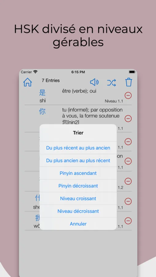 * Les caractères simplifiés, le pinyin et les définitions françaises sont inclus.