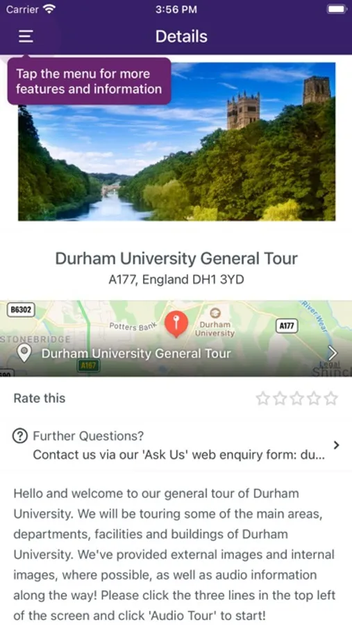 Within this app we are offering the chance to take tours of different aspects of Durham and our University. The tours provide information about many different buildings and locations in Durham as well as providing images of each stop. Additionally, we have videos showing you how walking routes between destinations. The tours can be taken remotely from the comfort of your own home, but can also be used to take self-guided tours around the city!