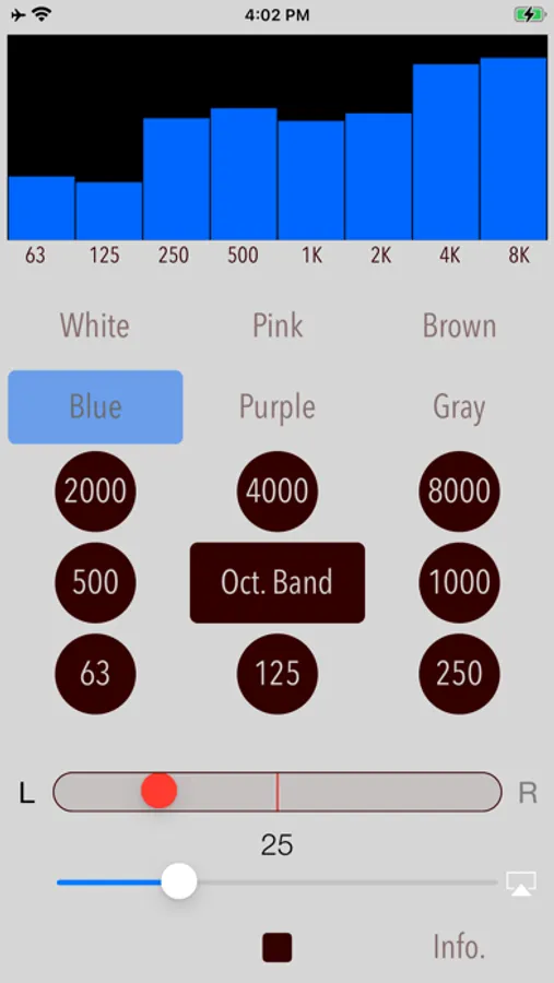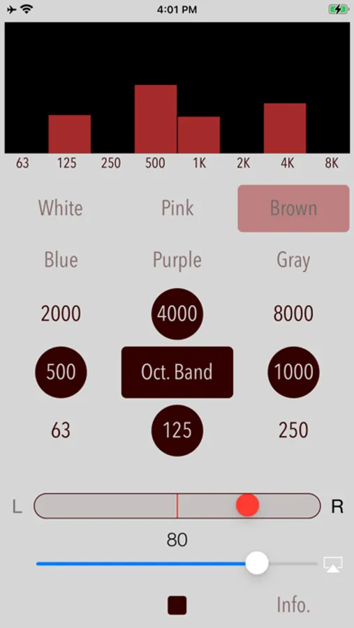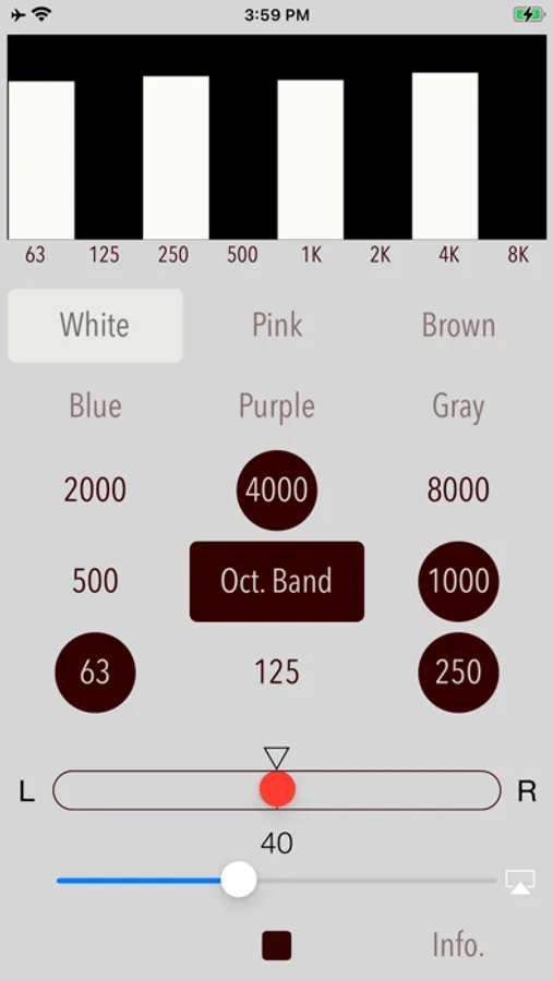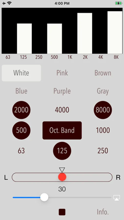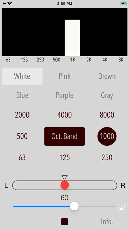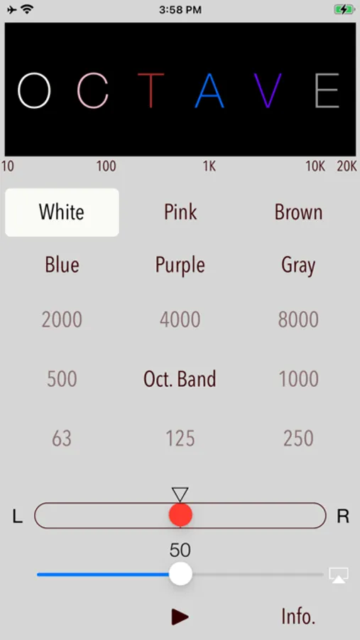 - Octave band noise is also useful to adjust the characteristics of the audibility of earphones or headphones. For example, by selecting the pink noise and playing the 1/1 octave band noise in the order of 125Hz, 1KHz, 8kHz of the center frequency, you can determine the intensity of each frequency band on the audibility. If you know the characteristic of frequency band, you will be able to adjust the earphone in the equalizer to your favorite sound easily.