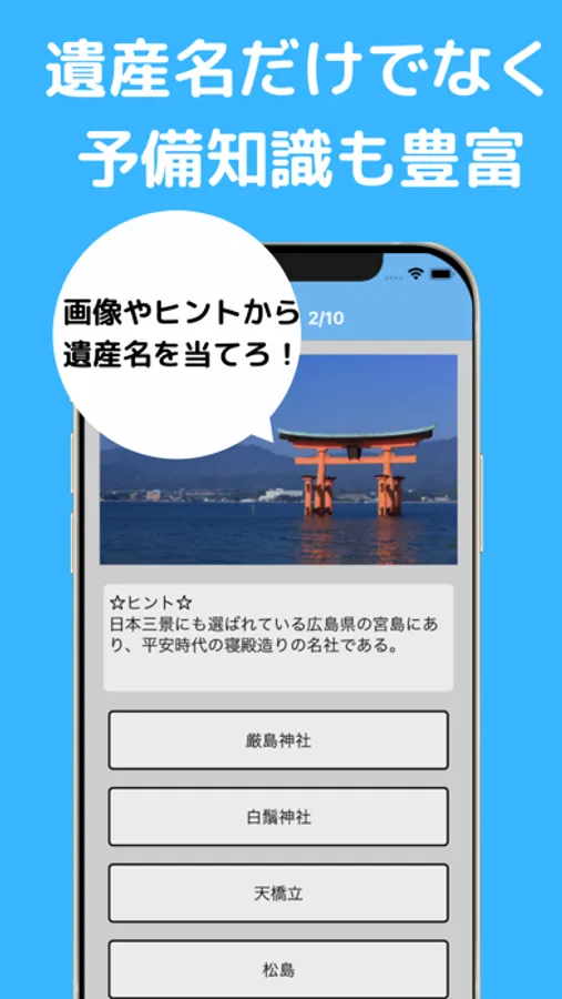 ヒントや画像をもとに世界遺産名を当てるクイズです!