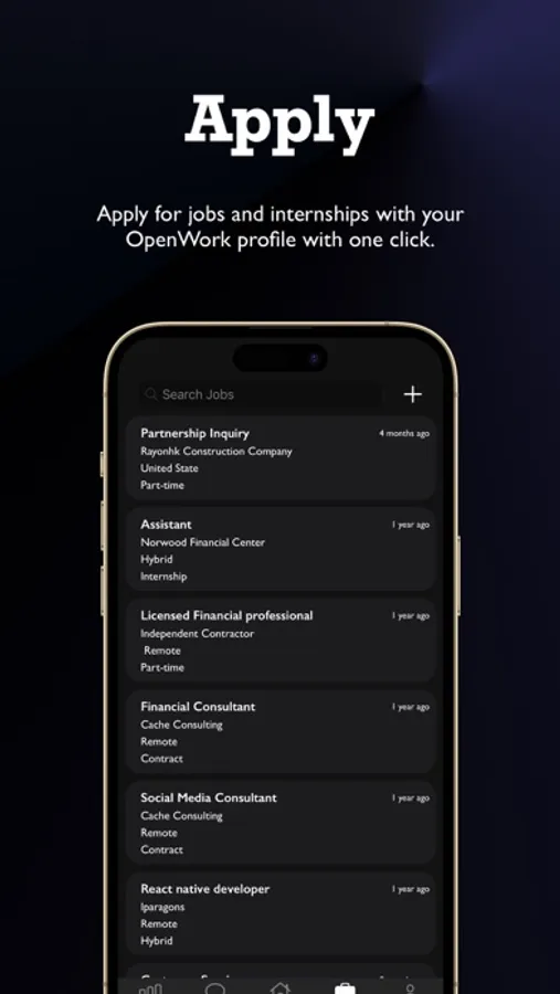 Whether you are a large multinational corporation or a family-run business, our job feature is built to help you find the right employees efficiently. Simply click the ‘plus’ button on the jobs tab, answer a few questions related to the job opening, and your posting will be featured on the jobs tab for users looking to make a change in their career. You can then go through all the applications and start a conversation with your candidate directly on OpenWork.