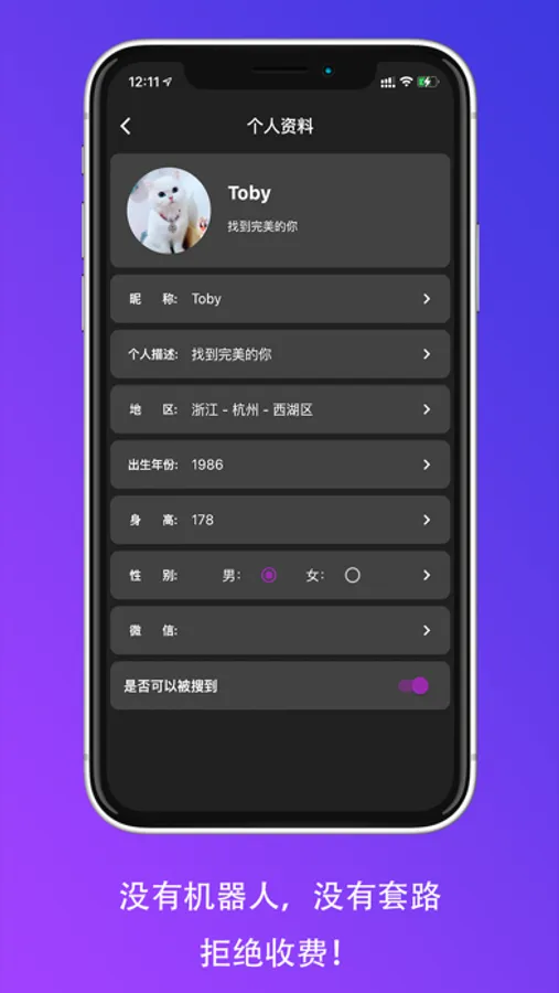 离线一样能被搜索到:填写信息后,就算不开app,一样有机会被其他人匹配到,然后添加你!