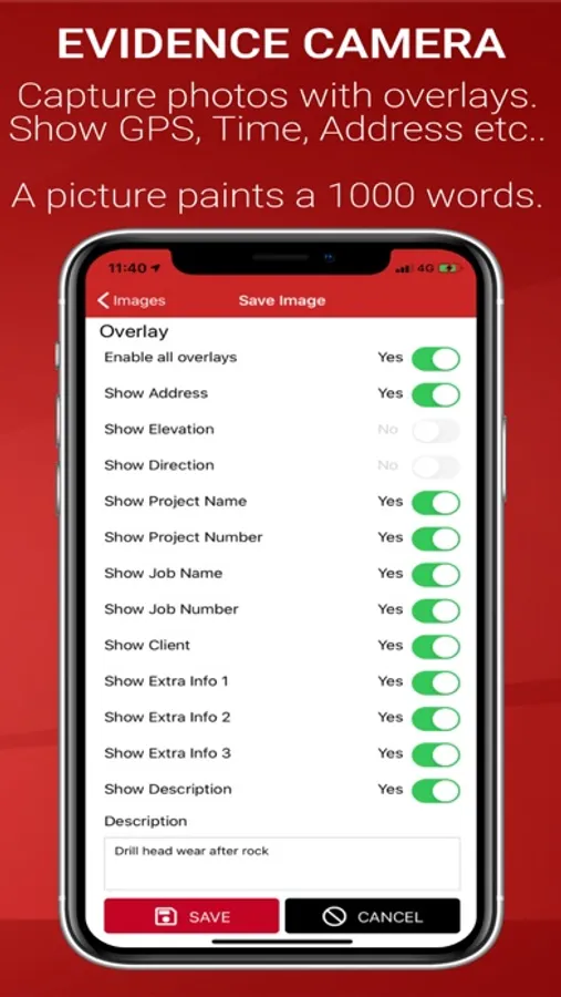 - Capture site photos with custom overlays. Show GPS location, timestamp, address, project details, customer details, and more.