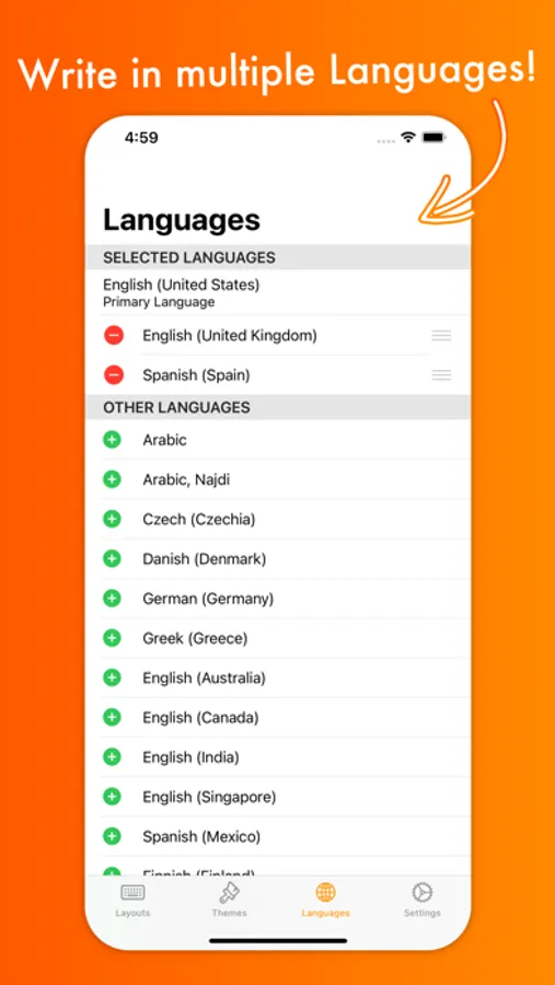 Theme customization can be used to change every aspect of your keyboard: background and foreground colors, shadow and border sizes and their colors, key corner radius and you can even set a custom height for your keys! Even a custom keyboard background image is configurable with your own photo. In the section “my themes”, you can see and manage all of your customized themes.
