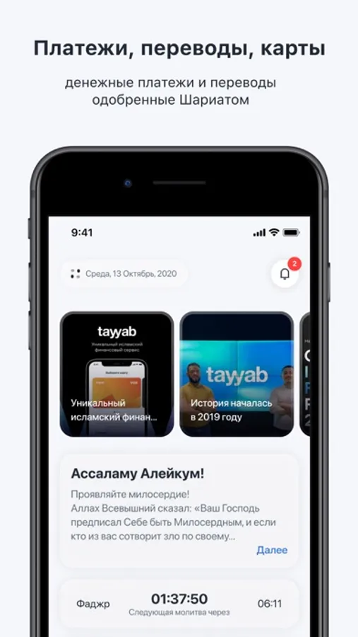 Вы можете совершать денежные переводы, делать ежедневные оплаты и управлять своими финансами в соответствии с нормами Шариата в приложении Tayyab с помощью международной карточки VISA, одобренной Шариатским советом.